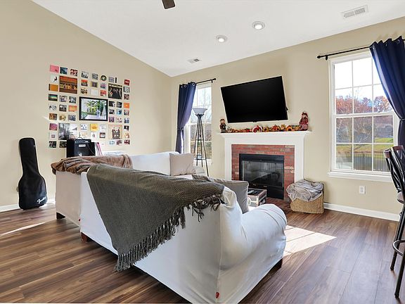 Move-in ready 3 bedroom, 2 bath home with pond view in ideal location just minutes from popular Fishers and Nickel Plate Districts, with easy access to I69 and SR37. ASSUMABLE VA loan with interest rate of 2.5%! Home features luxury vinyl plank flooring throughout the main living space as well as kitchen. Open living space with brick surround gas fireplace looking out into back yard with view of the pond. Back yard is fully fenced, with patio space as well as a fire pit overlooking the pond. Eat-in kitchen with granite countertops, pantry, and built in wine rack. All kitchen appliances included. Home boasts a split floor plan. Large master bedroom (currently utilized as both homeowners' office space) at the front of the home with wall of windows allowing for plenty of natural light. Master bath with double vanity. Two bedrooms on the other side of the home and a neutrally painted full bath.