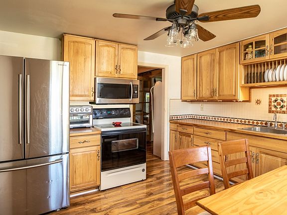 Creative. Color. Design. This upbeat residence lives like a rambler, offers all sorts of living space, and brims with delightful style. Notable features: Comfortable living room, fireplace with insert, fresh eat-in kitchen (appliances stay), classy lighting and ceiling fans, French doors and much more. Lavish, elegantly-appointed baths. Three bedrooms on main include expansive master; two bedrooms feature knotty pine finishes. Plus: Finished building in back is the ideal get-a-way. Paved patio for summer BBQs. Fenced yard, plenty of off-street parking.
