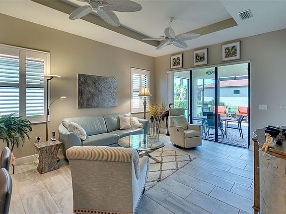 FABULOUS...with a capital "F"! This gorgeous Medina plan features 2 bedrooms, spacious den, 2 baths and a "killer" great room & chef's kitchen! Luxury finishes and custom details unparalleled at this price point! Porcelain plank tile in all main living and spectacular Sunset Spice wood floors in bedrooms. Designer plantations shutters, decorative light fixtures and fans compliment every room of the home! Kitchen accented with wood espresso cabinets, "leather" granite, designer back splash and top of the line SS appliances. Master bath is chic and modern with a fabulous over-sized shower with expansive glass work along with custom closets. Seller had added whole house gas generator and solar glaze on all windows for energy efficiency. Relax on the expanded paver brick screened patio and sun deck. Impact resistant decorative leaded glass front door recently installed. This home is definitely "MODEL PERFECT" and should be a "MUST SEE" for all discerning buyers who can appreciate FABULOUS! Call today...easy to show! NO CDD FEES! Monthly fee includes Social Membership, Internet, Cable, Lawn, Gated Community. Great Value!