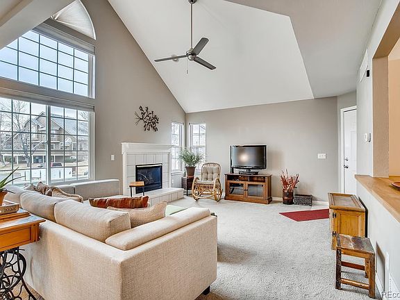 South facing and sun-drenched end unit townhome in secure gated community, boasting tasteful updates and comfortable living. Living room features a vaulted ceiling and a cozy fireplace, dining room has a custom wall finish adding light and depth to the room, and kitchen features plenty of counter space and newer stainless appliances. Upstairs find a master suite, complete with sitting room and ensuite bath, and a second bedroom and full bath. The basement has been finished as a flex space, with egress windows and large closet so it may be used as a bedroom or additional family room. Basement half bath would easily expand to add a shower if desired. Private patio area is perfectly sized for outdoor dining or lounging, with space for a pet to stretch their legs as well. Attached garage features smart close technology and offers lots of addition storage space. Secure gated community has pool and clubhouse. Easy access to shopping, restaurants, and an abundance of open space options.