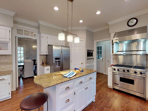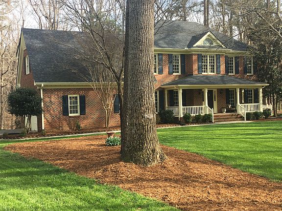 Updated all brick 2-story home with a large covered front porch on 1.4 very private acres in Wood Valley. Open floor plan, gourmet kitchen with Viking range, 9 foot ceilings, refinished oak hardwoods, & DS guest suite with full bath. Large master suite w/ cathedral ceiling in sitting area & newly updated bath. All bedrooms have large W/I closets. Deck leads to a brick patio and Koi Pond. Close to RTP, RDU & Brier Creek. Top quality Leesville schools: Jeffrey's Grove & Leesville Rd. Schools, pls verify.