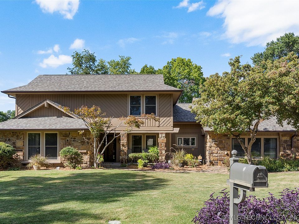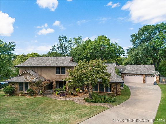 Welcome to South Tulsa living in this beautiful home nestled within the prestigious Jenks Southeast Elementary School district. Primary bedroom is on the first floor. This home has two bedrooms downstairs and two bedrooms upstairs. Second bedroom downstairs has built-ins and could be used as a home office. Two living rooms, one that has a fireplace and the second living room has a private entrance and could be redone as a second primary bedroom or in-law suite. Tons of storage throughout. Amazing outdoor space with an in ground salt water pool and large covered patio perfect for entertaining. Detached 3 car garage with built in storm shelter in the ground. Brand new roof on home and garage 2024. Situated in a tranquil cul de sac, the property has mature trees on a sprawling 0.3 acre lot offering both privacy and serenity in a gorgeous tree lined neighborhood.