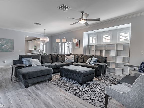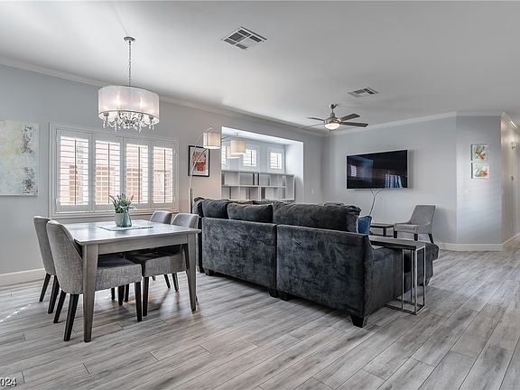 Welcome to your dream single story home within the resort style gated community of Desert Bloom in Summerlin! This impeccably maintained residence boasts convenience and style with its open floorplan, Modern Remodel with no Expense Spared. Enjoy the elegance of plantation shutters, sleek quartz countertops & stainless steel appliances, complemented by custom soft-close shaker style cabinets. Enjoy commercial Aqua Guard laminate flooring that flows seamlessly throughout. Stay comfortable year-round with a newer HVAC system and a water heater installed in 2022. Built-in closet organizers, upgraded light fixtures & garage with overhead storage & epoxy flooring. Upgraded LED can lighting throughout, entire irrigation upgraded. Rare fully fenced yard with a private courtyard and covered patio to enjoy Alfresco Dining and outdoor lounging. Close proximity to the BEST schools, parks & shopping, Downtown Summerlin, Red Rock Hotel, Costco & Paseo with walking trail. This home is Move In Ready!