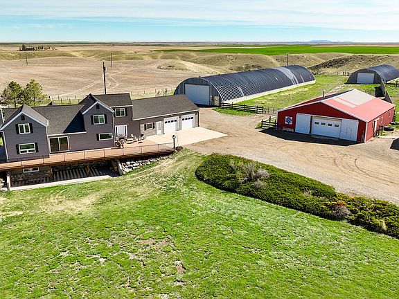 This 160-acre rural ranch estate, with Rocky Mountain Front views, combines SO many desirable features: find a 5100' beautifully remodeled home, a 40'X320' livestock barn, 60'X80' (+ more) shop, a 50'X200' and a 40'X50' quonset, detached 4-car garage, attached 2-car garage, full guesthouse, and converted chicken coop! The home has 5 bedrooms and three bathrooms on three levels. The kitchen is spectacular with custom cabinets, exotic granite, high-end appliances, double ovens and LVP flooring! The floorplan invites entertaining with doors to decks and patios on all levels. The metal livestock barn offers enclosed stables, a sink, storage, indoor corrals and easy access to outdoor corrals and water. The shop has two furnaces, three 14' doors, CONCRETE floors, a bathroom, washer/dryer hookups, and a kitchen area. Quonsets have 16' doors at each end, dirt floors, electricity, and can serve a multitude of uses. Agent owned. Call Lynn Kenyon at 406-770-0013 or your real estate professional. The detached "car garage" has heat, electricity, concrete floors, a floor drain, an enclosed storage room, metal roof, and enough space for multiple vehicles and toys! Main home has new lighting, flooring, woodstove, pressure tanks, central air, Trex deck, metal rails, an extensive sprinkler system, paint, wallpaper, furnace, pressure tanks and more. Buyers will also appreciate the mature wind belt and a fenced garden space near the home. The "canning room" room (between the house and garage) is the "hardest working room in the house," says seller, with a gas fireplace, sink, counter space, a Pioneer Princess press wood cookstove, closeted storage with shelves and concrete floors. The land is about 71+ acres of cropland; the remainder is pasture. Hydrants are in several locations on the property. If you are looking for a hunting spot, seller says deer bed down in the former reservoir and he has seen elk pass through the property. Pheasant are prolific on the property too. The fully remodeled guesthouse is at the edge of the property. It is so well-done, with a farmhouse vibe, and has a bedroom, two loft/bunk spaces, all new cabinets, wood-lined walls, a bathroom, new doors, appliances, separate septic, and propane tank. Consider it for kin, guests, or as a nightly or monthly rental. NO COVENANTS, so bring your ideas, livestock, horses, guests, and business ventures. Seller leases farm ground. The drive to Great Falls, from this Dutton location, is approximately 35 minutes and it's not all a dirt road! It has easy access to I-15.