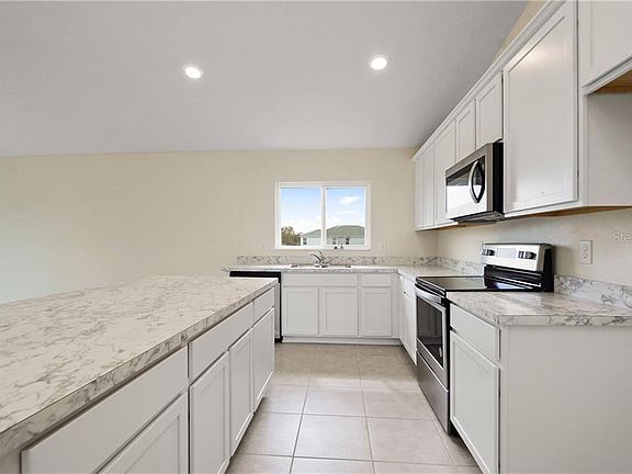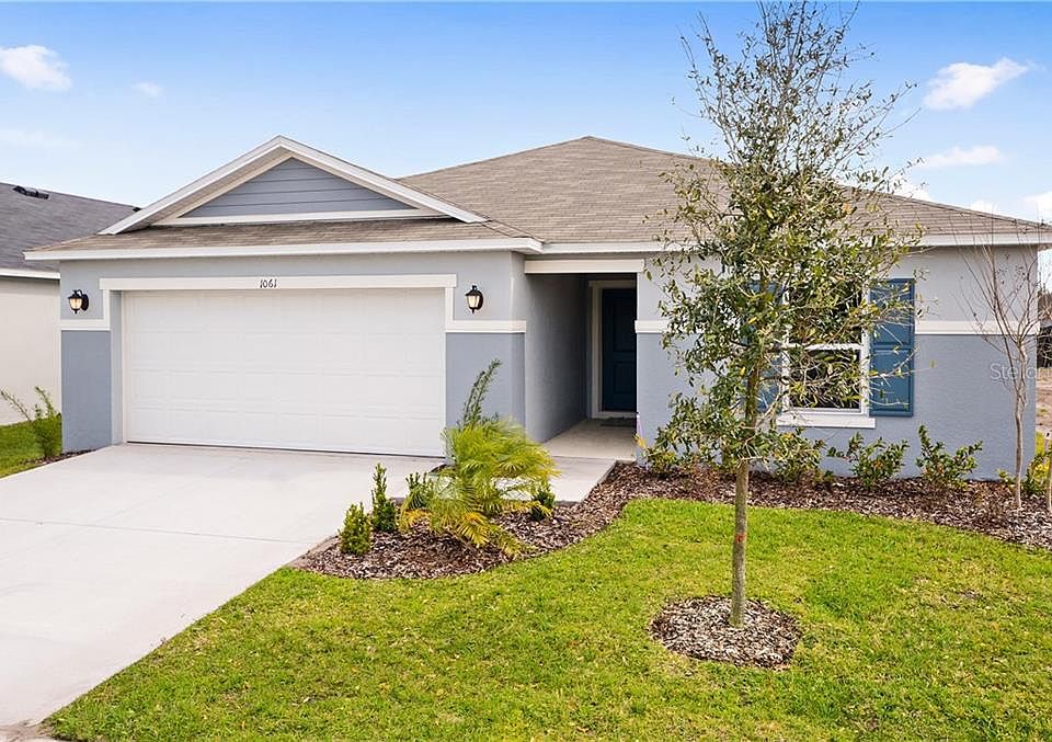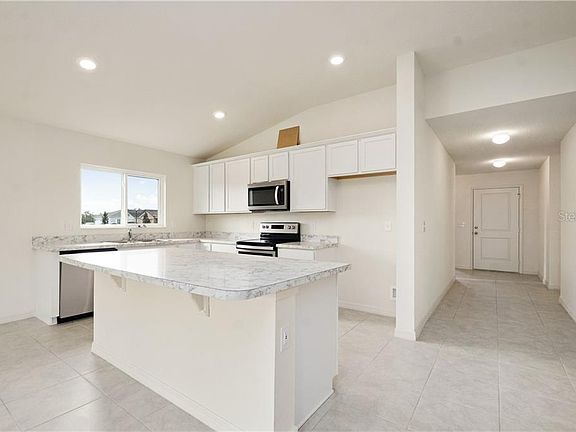 This charming home is located across the street from the community pool and cabana. Moving inside, you'll find three secondary bedrooms at the front of the home, along with a laundry room for added convenience. The entry hallway opens to a large great room, kitchen and dining space, and this area features volume ceilings and tons of natural light. The kitchen comes complete with an island, cabinets in the color Cotton with crown molding, and Whirlpool® stainless steel appliances. The master suite is located at the back of the home for a quiet retreat and offers a luxurious master bath with an enlarged walk-in shower featuring tile surround, an extended dual-sink vanity, a linen closet, and walk-in closet. This beautiful home also features upgraded tile flooring throughout the main living and wet areas. Outside, a large covered patio is perfect for entertaining.