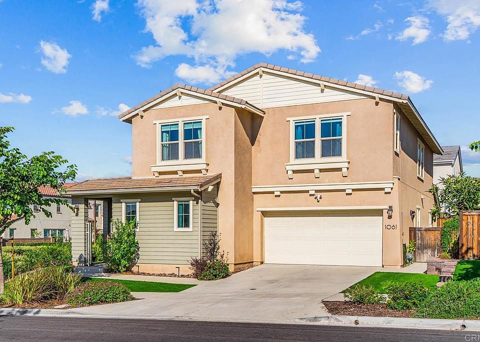 Welcome to 1061 Calle Pilares in the highly desirable Village of Escaya community in Chula Vista, California. This two-story, 4-bedroom, 4-bathroom single-family home offers approximately 2,891 square feet of living space on a highly desired lot that combines modern upgrades, energy efficiency, and community living. Built in 2018 with only one owner, this home features updated flooring throughout both levels, with builder finishes and natural light in every main living space. The open-concept main floor includes a spacious living and dining area, a large kitchen with modern appliances, ample cabinetry, and an oversized walk-in pantry for organized storage. Upstairs, the primary suite includes a spa-style ensuite bathroom with a soaking tub, glass-enclosed shower, dual sinks, and a generous walk-in closet. Three additional bedrooms and multiple bathrooms provide flexible space for family, guests, or a home office setup with upstairs laundry in its own private room. The backyard is designed for comfort and entertaining. The covered patio with recessed lighting overlooks low-maintenance turf landscaping, perfect for outdoor dining or relaxing evenings. The 2-car garage is EV charger pre-plumbed and the home includes solar panels, offering energy savings and eco-friendly living. The usable driveway adds convenience that is only common on select Escaya homes. The Village of Escaya is known for its walkable layout, community parks, and resort-style amenities including a pool, fitness center, and clubhouse. Residents also enjoy access to top-rated Chula Vista schools, local shops, restaurants, Paseo walking trails, 2 Parks, community events, 2 dog parks. Easy freeway access connects you to downtown San Diego, or the Tijuana border the coast, The Cross Border Xpress, and regional attractions within minutes. This property represents an excellent opportunity for buyers looking for a move-in ready home in one of Chula Vista’s most modern and connected neighborhoods.