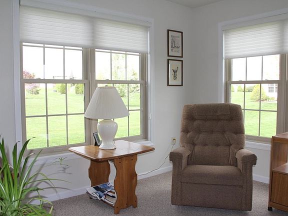 Includes use of clubhouse, exercise rooms, walking trails, pond. Open floor plan, 12x10 patio, Hunter Douglas Silhouette, window treatments & in-house audio, ceiling fans in every room. Exterior flexlite garage. Private community. Fee includes land rent, trash and snow removal of streets.