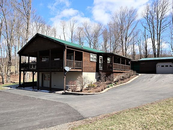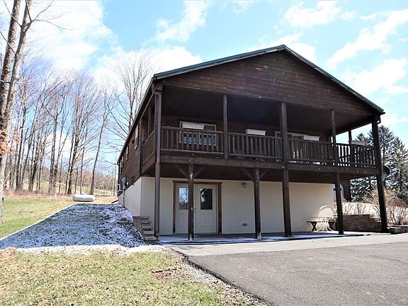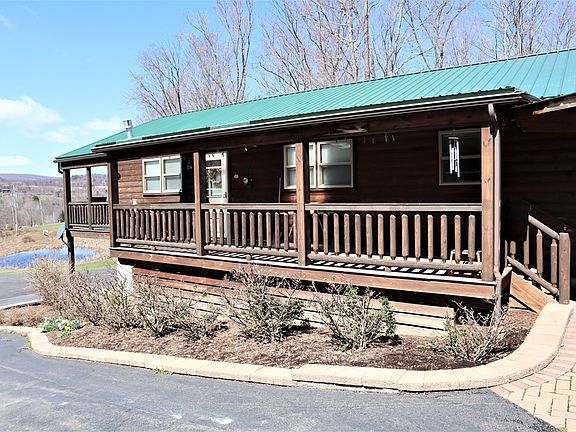 Beautiful log home was built in 2013 & sits on 2.8 acres including a small pond. Home features an open floor plan including the living room, dining area & kitchen (w/ a large island). The laminate flooring throughout the entire house makes it for easy maintenance. There are 2 bedrooms & 2 bathrooms. One bathroom is in a bedroom & the other bathroom also includes the utility area. The home has forced air heat with propane as well as central AC. The unfinished walkout basement is unfinished & with the high ceilings it is ready for the folks who wish to add additional living space. Ready to relax? You have your choice of the front covered porch or the deck (off the dining room) overlooking the pond.