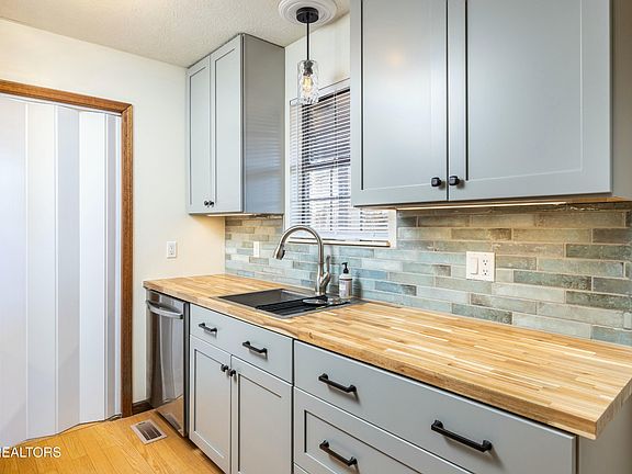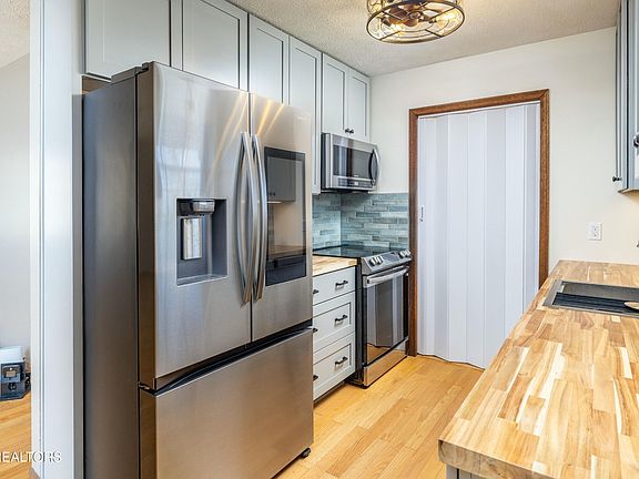 This charming cabin-style home is updated with modern touches, including a sleek kitchen featuring new cabinetry, butcher block countertops, and high-end stainless steel appliances. The laundry room comes with a newer stack washer and dryer that will stay with the home. Beautiful hardwood floors flow throughout, including all three cozy bedrooms. There are two full baths, one of which is an ensuite to the larger bedroom.
