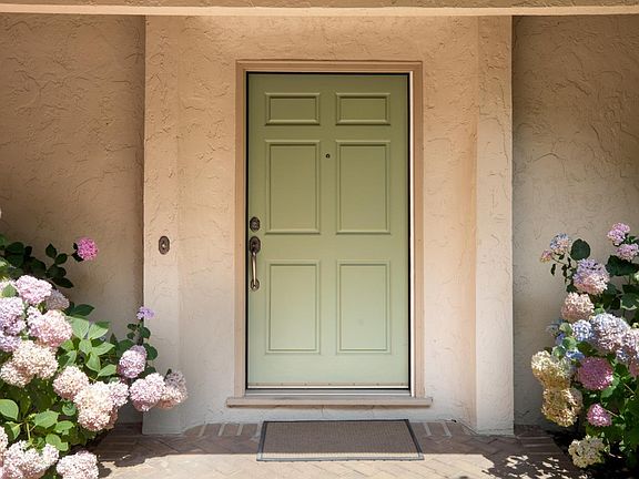 Mature trees and a handsome masonry wall create a sense of privacy and serenity at the front entry, while a charming water feature by the door sets a welcoming tone.