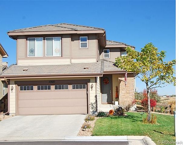 Beautiful home on larger lot that sides to open space at end of cul-de-sac that only has 3 homes on the street instead of 4 like the rest. Beautiful finishes, "great room" floor plan, secluded master bedroom with large walk-in closet and 4 piece bath. Lots of windows and vaulted ceiling in dining room, kitchen has island and lots of storage and is great for entertaining. Convenient upstairs laundry room and great sized bedrooms. The basement is unfinished and has 9' ceilings and egress windows, ready to be finished. Awesome "Geodeck" to watch the wildlife and "Plush Grass" synthetic turf in back-no worry for dogs, no mowing or watering, looks fantastic year 'round and landscape lighting front and back. Fantastic pool, clubhouse, playground, walking trails and more. Easy access to I-25, Light Rail, Sky Ridge Med Center, dining and entertainment. Blinds throughout and drapery rods and curtains stay-quick and easy move-in.