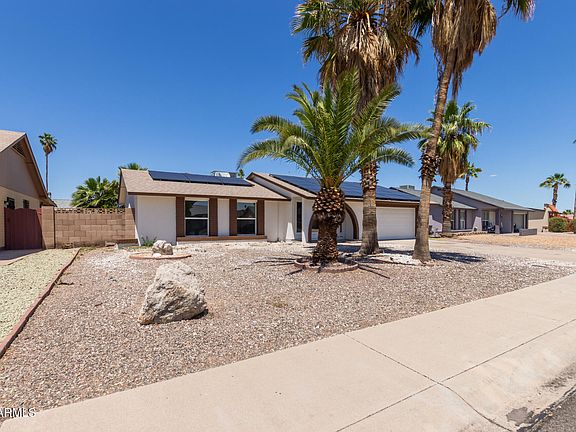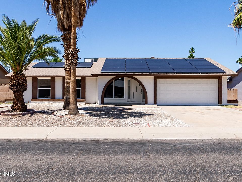 60K WORTH SOLAR SYSTEM PAID OFF!! Enjoy little to no APS bills! BEAUTIFULLY REMODELED 3 beds, 2 baths, 2-car garage, & a low-care landscape. The highly upgraded interior boasts clean lines that promote a modern feel! Natural light filled the spaces, complemented by new features including neutral paint, stylish light fixtures, ceiling fans, & wood-look flooring w/carpet in bedrooms. You'll love the welcoming living room paired with an electric fireplace. The large, renewed eat-in kitchen has new SS appliances, quartz counters, a tile backsplash, & white cabinetry. The main bedroom includes a walk-in closet. Both bathrooms have new fixtures. Check out the spacious backyard with a covered patio & multiple seating areas! Move-in ready
