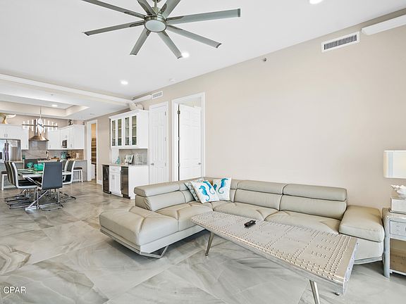 You need to see this one in person as you won't find anything like it in Panama City Beach! Gorgeous new updates throughout this unit to include a fully upgraded kitchen, bathrooms, and 24'' x 48'' porcelain tile floors throughout. 10' ceilings along with recessed lighting, custom bunk beds for 4, and motorized shades add functional elegance to your experience. All of the bedrooms come complete with their own bathroom and the two master bedrooms have breathtaking gulf front views with balcony access. The 450 square foot balcony is one of the largest anywhere with dimensions of 12' x 37' and comes with new Polywood furniture to complete your outdoor coastal experience. This would make a lovely primary home, vacation home, or would also serve well a short term vacation rental. The building has also been refreshed to include a new roof and exterior paint with new elevators and landscaping currently underway. This well appointed penthouse comes fully furnished and is ready to welcome its new owners.