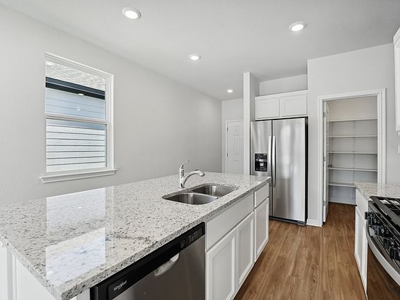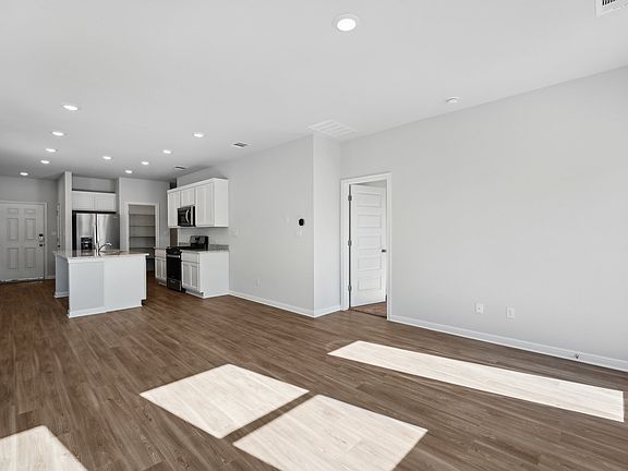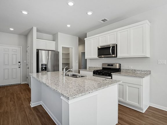 The single-story Isabel floor plan showcases an open-concept layout, centered around a welcoming great room and encompassing a dining area and a large kitchen with an island and a walk-in pantry. Two secondary bedrooms and a shared bath are across the hall, and the spacious primary suite is toward the back of the home, complete with a walk-in closet and a private bath. Options may include: Primary shower in lieu of bath