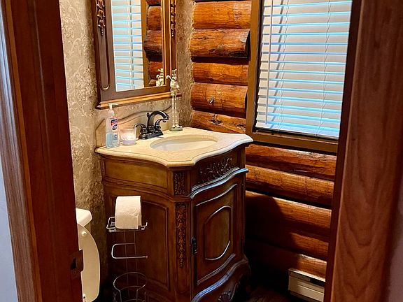 Location, location, location! This gorgeous 4 bedroom, 2.5 bath log home sits on 7.95 acres yet is just over 1 mile from town. The interior offers beautiful exposed log beams and natural wood work. The exterior offers a back deck with gazebo, stream with bridges, woods, cleared open land, stable, shed w/floored loft. In addition, a 23'x40' outbuilding currently being used for dog grooming offers endless business possibilities.