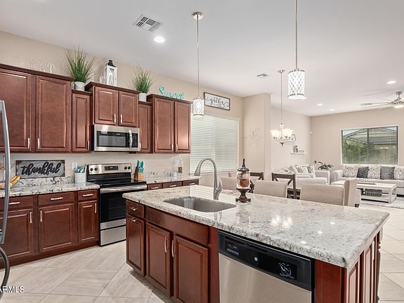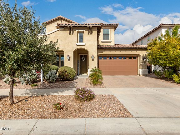 Venture upstairs to discover the grand master bedroom, complete with a second-floor balcony overlooking your oasis. The master ensuite boasts a walk-in super shower with floor-to-ceiling designer tile, a spacious closet that conveniently connects to the upstairs laundry room, providing both luxury and practicality. Two additional guest bedrooms and a full hall bathroom ensure there's plenty of room for family and guests. Ample walk-in closets throughout the home offer abundant storage options. This residence is an entertainer's dream, both indoors and out. Whether you're hosting gatherings in the fabulous interior living space or enjoying the backyard oasis, this home is designed for making memories. Situated in the highly sought-after Eastmark Community, just off the 24 and Ellsworth, you'll find yourself minutes away from shopping, dining, and vibrant nightlife. Don't miss the opportunity to call this Eastmark gem your own!