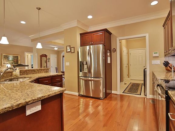 One of the nicest, most spacious, newer patio homes you will find this close to town. Open plan, high ceilings & hardwood on main level except for BR's & BA's. Former model home, it is wheelchair accessible, no steps from garage or in the master shower, wide doorways. Double sided black granite FP between living area & den which opens to the deck. Espresso 36" high cabinetry, Amarillo Boreal granite & stainless appliances. Built-ins in laundry rm. 2nd BR & BA on 1st fl, 3rd BR & BA in walkout LL with open family area with built in TV/bookshelves, & a bar with full size refrigerator. Screened in covered patio accesses the green space lined by evergreens. Amazing amount of storage including a cedar closet. Quiet location at back of the neighborhood.