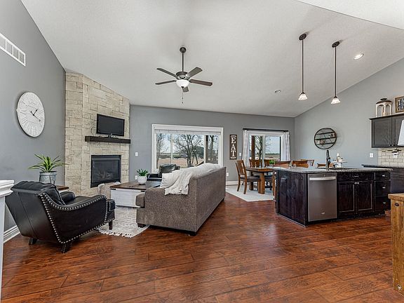 Welcome home! You're going to love this better than new home! The open floor plan features 4 bedrooms, 3 bath, 3 car garage and a private backyard! On the main floor, you'll find a large open living room with vaulted ceilings, gas fireplace and large windows. The living room is open to the large dining and kitchen. The kitchen features a large island with granite counters, beautiful cabinets, eating bar, and a pantry! There is a large bedroom and full bathroom, and of course a gorgeous primary bedroom. The primary bedroom is very spacious, and you'll love the large window overlooking the backyard. The primary bathroom is spa-like! With double sinks, bathtub, closet, and shower, you'll never want to leave! Downstairs you'll find a HUGE family room with built-in entertainment center, two additional bedrooms, one full bath, and additional storage. Southern Ridge is the PERFECT neighborhood to call home. With wide streets, sidewalks, green space, and TONS of new amenities, you'll never need to leave. Southern Ridge has a large pool, sport court, playground, ponds, and so much more!