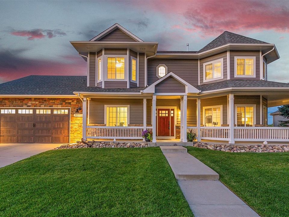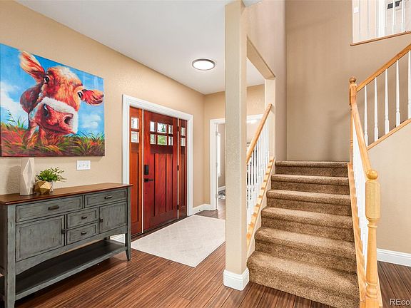 Rare opportunity to own a stunning two-story Victorian home on a premium lot backing Cherry Creek Trails and lush open space in Clarke Farms. Impressive curb appeal featuring a newly painted exterior (2023) in tasteful hues, a luxury garage door, and a custom front door separate this home from the neighborhood. Enjoy a morning cup of coffee or an evening wind-down on the fabulous wrap-around porch, offering a perfect vantage point of the picturesque greenbelt. Inside this exquisite home, find six generously sized bedrooms and four bathrooms designed with comfort and convenience. You'll love the spacious living room for entertaining, the bright & open great room for gatherings, & the recently redone kitchen. Cooking is a delight in this gorgeous kitchen adorned with white cabinets, stainless steel appliances, a custom tile backsplash, a center island with stylish counters, and a pantry. A large walk-out basement with sliding doors to the backyard can function as a mother-in-law suite with a full bathroom and bedroom with a walk-in closet. Relax on the grass areas or enjoy your garden beds. The covered patio and deck in the backyard are made to enjoy beautiful Colorado summers. Walking distance to Cherokee Trail Elementary School and the community pool. Hickory House, Downhill Brewing, Dutch Bros, West Main Taproom + Grill, Home Depot, Safeway, Target, Best Buy, and so much more, all within 10 minutes. This home's careful maintenance, tasteful updates, and unbeatable location make it a standout property.