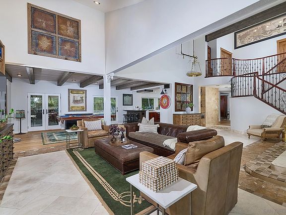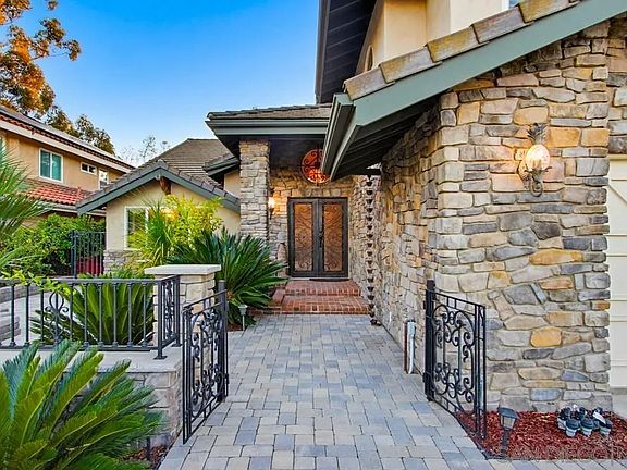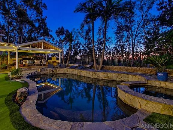 Curated semi-custom home on a serene cul-de-sac. An entertainer's vision has come to life in this home—large open gathering rooms, a kitchen with luxurious appliances, exceptional backyard amenities, impressive wine storage, and owned solar! Bedroom on the first level, a lift/elevator to the second floor-a rare feature! Every element has been intentionally selected; nothing overlooked, nothing ordinary. This residence is for those with a discerning eye and a lifestyle that calls for something truly above and beyond. Ideal for unforgettable celebrations, your circle will undoubtedly jump at the chance to attend. Striking double glass front door, and rich travertine and hardwood floors set the tone for this one-of-a-kind architectural gem. Big, open, and bright layout. Furniture-style kitchen cabinetry is one of a kind. The refrigerator and freezer are separate, offering prime space. Marble counters and backsplash are uniquely designed and beautiful. Large island and an additional prep sink area. Dacor 6-burner cooktop and double-door/use dishwasher. This is a dream kitchen! Family room features a gorgeous wood and stacked stone fireplace, while a custom, climate-controlled wine room adds a unique touch. The entry-level bedroom has a set of French doors, creating a private entrance. The primary suite offers a deck, office space, and a spa-style bathroom with heated marble floors, dual-vessel sinks, and a river-rock walk-in shower. Two balconies provide additional space for the primary and a secondary bedroom. Outside is an entertainer’s dream: pool with Baja shelf, huge covered area and pergola, pizza oven, smoker, BBQ, putting green, and a walk-through large storage shed. Best of all, an owned solar system that will save you $$$. Every detail has been considered with a designer's eye and a contractor's touch. Do not miss your opportunity to own this "One-of-a-Kind" Gem in Scripps Ranch.