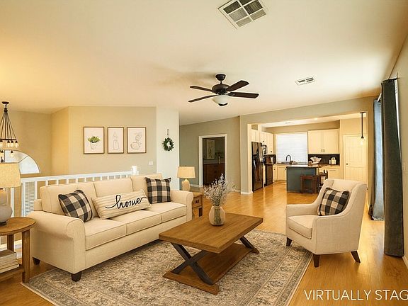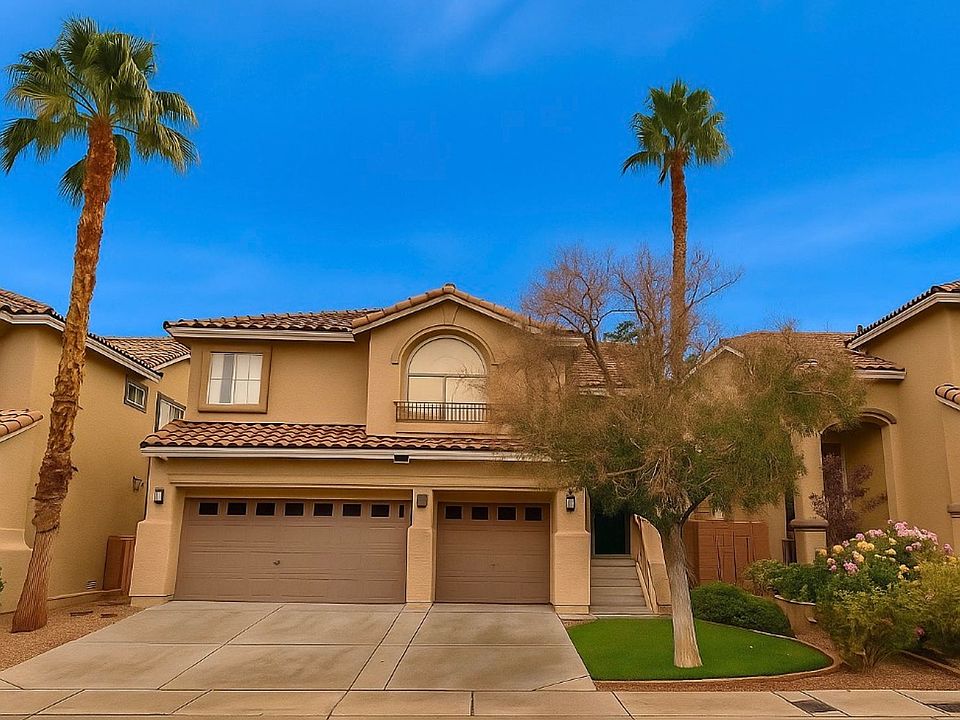 This stunning split-level rental property in North Summerlin boasts 3 bedrooms plus a den, 2.5 baths, and a pool with a spa. Custom paint accents the bright, open layout, including a palatial living room with a fireplace and balcony overlooking panoramic views of downtown Las Vegas and the strip. The island kitchen features newer appliances, granite tile counters, and a breakfast nook with a bay window. The spacious primary bedroom offers an en suite bath, while a cozy family room downstairs provides the perfect retreat. Additional amenities include a den, laundry room, and access to the covered balcony and backyard oasis, complete with majestic palms. Small pets under 20 lbs accepted in case by case basis, owner must approve.