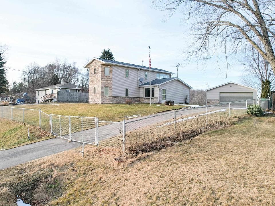 This unique home features 1st floor bedroom. The upper Sun room gives views of the countryside that could easily be a master bedrm. There is a walk-in tub in the bathroom. Patio door off dining room goes to 3 season room that is airconditioned but not heated. 2 additional sheds for storage or animals. The garage has a heated workshop in the back. 2 gas fireplaces. There is a dog kennel that will stay. Spend your summer evenings on the patio watching the stars after dark. Entire property is fenced in with gate for entrance. Ultimate Home Warranty with well pump and septic system included.