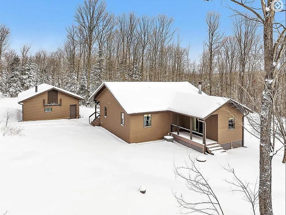 Meticulously maintained ranch home with oversized garage situated on 57.51 secluded wooded acres with trails throughout the property. Abundant wildlife offering excellent hunting opportunities. Home offers open concept great room w/vaulted ceiling, fieldstone floor to ceiling fireplace & has built-in wood storage with outside access. Kitchen features hickory raised panel cabinets, large counter & dining area. Newly added 3rd bedroom has built-in storage, glass door to covered porch & is currently used as 4 season room. Walk-out lower has family room, bonus room that is used as bedroom & separate workshop area with access to backyard. Garage is finished, heated & has 12x20 storage area w/outside access.
