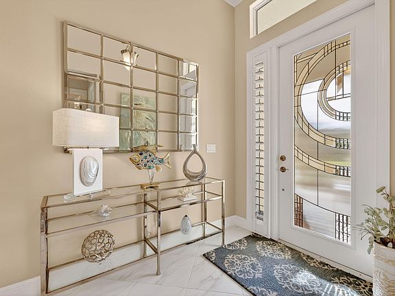 One of the best locations in PGA Verano. This waterfront Lago model is 2 bed,2 bath plus a flex room on the Island of Capraia which is surrounded by water & on dead end street with cul-de-sac, so next to no traffic. Home sits on large water lot with room for a pool. Inside of home is spotless with Carrara porcelain tile everywhere but bedrooms. block construction, impact window & doors so no shutters to deal with. Split bedrooms plus a flex room & open floor plan. Custom kitchen with Blue Pearl Granite countertops & walk in pantry. Large kitchen island to entertain overlooking great room with cathedral ceilings & custom molding and cabinetry. All windows have plantation shutters, motorizes shade on sliding doors, All doorways are 8 ft high with 11 ft ceilings with fans in every room. Large primary suite with 12ft tray ceiling and primary bath includes custom tile finishes.Ample laundry room with plenty of cabinets & wet sink.New A/C system in 2023 & water heater 2025. Outside enjoy a 25X12 covered lanai with cool deck & outdoor kitchen.In addition the owners extended the rear patio to additional 18x40 all screened in overlooking the water. HOA fee includes a manned guard gate, fast internet,alarm monitoring,phone & cable w HBO, lawn care, shrubs & fertilizer.
