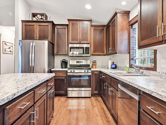As you enter this one owner home you will soon see and appreciate all the beautiful extras that have been added since it was built in 2018. It was built by Drake homes and includes vaulted ceiling, poplar woodwork, kitchen has 42" cabinets pantry, center island and stainless appliances. Both the bedrooms on this level feature walk in closets. The craftsman style wood and door toppers and 3 panel solid wood doors make this a very solid home. The additional features have been added by this homeowner including a maintenance free deck, fully fenced yard, irrigation system 12 x 10 garden shed and fully finished lower level including a great family room, dry bar and huge amusement room. The carpet in the lower level is brand new. The 3 panel barn doors accentuate the craftsman style. The garage is a dream garage with heat and beautiful 'Tiger's' paint job.