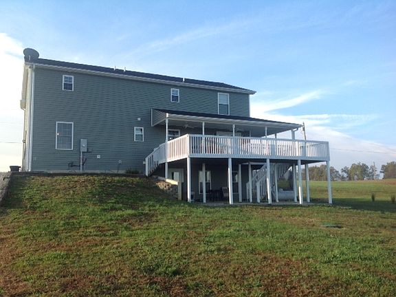 Spacious, two-story home located near Rineyville situated on approx. 5.465 acres featuring a wrap-around covered porch/deck stretching on three sides of the home providing a gorgeous view of the surrounding hills and pastures. This country home has numerous features and amenities: Electric heat pump with dual climate control zones; Kitchen has all stainless steel appliances with a gas stove, tile backsplash, large island w/cabinetry, and dual sinks; All four bedrooms have sizable walk-in closets; Large master bedroom/bathroom suite features a jetted tub, separate 4-ft wide stand alone shower w/glass door, can lighting, dual vanity sink, and a cozy electric fireplace; Finished, open-spaced walkout basement with a gas-log fireplace and a full bathroom. Huge, detached two-car garage has workshop space with an additional covered carport with RV electric hookup. In addition, the main-level family room features a comfy gas-log fireplace. Furthermore, this home has an underground pet fence, garden plot, working hen house, several fruit trees (2-apple, 1-peach), and a brick/stone fire pit. Both the laundry room/pantry and the hobby/recreational room are located on the main-level of home.
