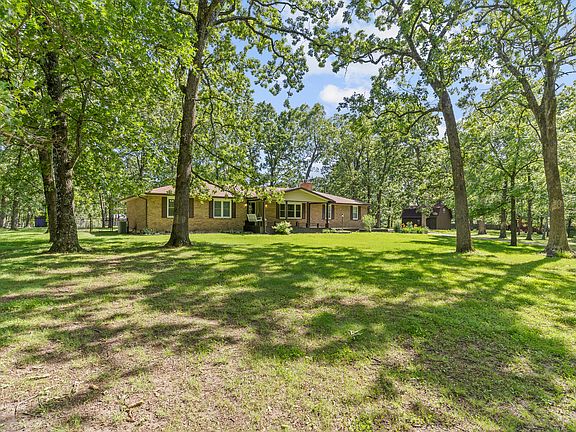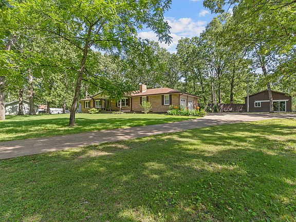 PRICE ADJUSTMENT- Schedule a showing with your favorite Realtor. Discover the appeal of this charming brick, one-level home set on a sprawling 2.38-acre double lot, featuring mature trees and ample space. The property includes a spacious 24 x 32 heated and cooled shop/rec building with a half bath, currently used as a family/recreation room. The home has been thoughtfully updated with new HVAC, wood flooring, granite kitchen countertops, backsplash, and stainless steel appliances. Additional enhancements include newer double-pane windows, an updated sunroom, and a newly fenced backyard. The main living area is warm and inviting, with a brick fireplace and built-ins. The cozy kitchen boasts lovely cabinetry, a new sink and faucet, and a breakfast area. The formal dining room offers built-in shelving, while the master bedroom features an electric fireplace for added comfort. Both full bathrooms are tiled, with a shower in the master bath and an updated tub/shower combo in the second bath. Outside, you can unwind on the covered porch or the patio, enjoying the privacy and space this lot provides. An additional barn offers extra storage. This home combines modern updates with a serene, spacious setting.