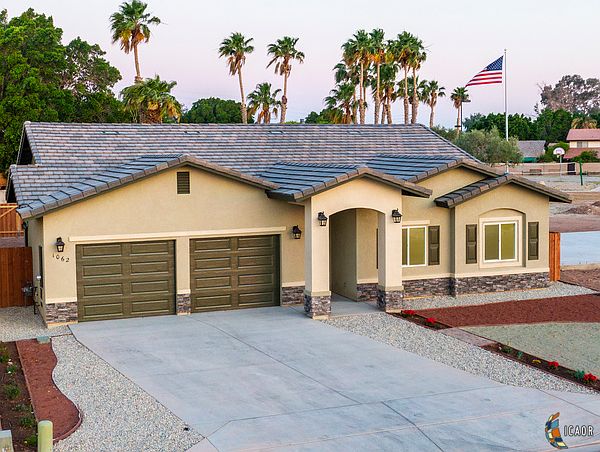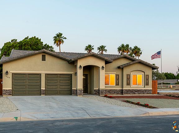 NO CFD. Luxury, Quality, Location! Hello, I am 1062 Crestview Drive in Brawley. I am a brand new home located in Ridge Park Village, a secluded and desirable neighborhood in Brawley. Elegance, modern design, high-quality construction, a large family room, and a vaulted ceiling are just a few of my jaw-dropping features! I have a stylish and modern two-tone spacious kitchen that has an island with bar-style seating, a skylight, and countertops of the highest quality. Top-of-the-line Samsung black stainless steel appliances, including a refrigerator, are included to make your cooking experience so much better. I've got a low maintenance, desert-style landscaping, a spacious, split-door, 2-car garage, and energy-saving LED lighting inside and out. Enjoy a resort-style master with a rain shower, large master bedroom, and a walk-in closet. My very large backyard has alley access and plenty of space for a pool, a patio, and so much more!
