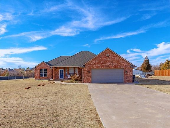 Quiet country living with Big Skies, wide open spaces and stunning Oklahoma Sunset views. 1.86 acres with storm shelter and fenced in yard. The kitchen is the Heart of the Home, beautiful gleaming wood cabinets, lots of counter space and storage, Stainless Steel 70/30 sink facing the living room, breakfast bar is ideal for Lively Conversations and Taco Tuesdays! Large Master Retreat with double doors to en suite bath, double sinks, Jetted Tub, step-in shower, walk about closet and private toilet. 3 bedrooms Plus Office or 4th bedroom. Spacious utility room has Deep Supersized Sink for soaking dedicates or bathing doggies. New roof in 2016. Large Covered Patio for bird watching, backyard fun and sunset views.