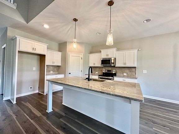 The beautiful Langdon Plan features open concept with Vaulted Family Room boasting wood-burning fireplace; spacious dining area, and kitchen ideal for entertaining. Kitchen features shaker styled cabinets, quartz or granite counters, tiled backsplash, and a large corner pantry! Stainless Electric Range/Oven, Dishwasher, and Microhood included. The Owner's Suite is nicely sized and features luxurious tiled bathroom with double vanity boasting quartz or granite counters, garden tub, and separate tiled shower. Also on the main level, you'll find mud room entry from garage, separate pocket office and guest bedroom/bathroom. On the second level, you'll enter into loft/study area leading to three guest rooms and a shared bathroom with double vanity. Mohawk Revwood flooring in much of the main level common area and tiled flooring in bathrooms. Fiber Cement Siding, Architectural Shingled Roof, FOAM INSULATED ATTIC and Rear Covered Patio.