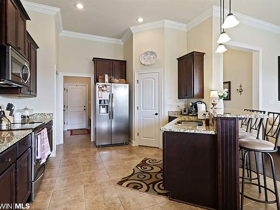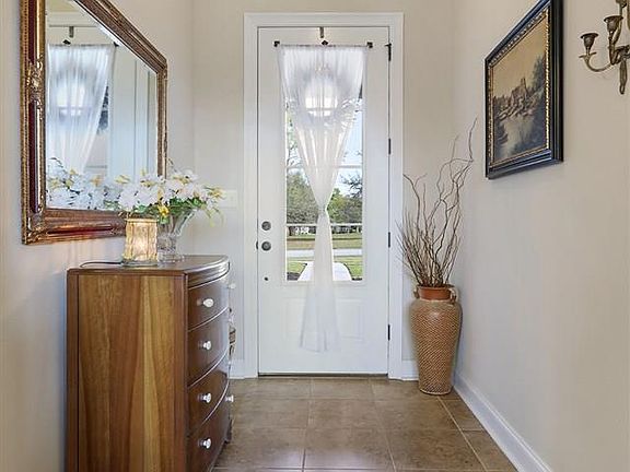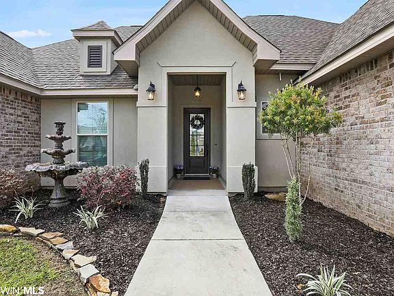Stunning DSLD home in Foley's Pebble Creek community! Pebble Creek is centrally located and minutes from the white sandy beaches and all Foley has to offer - Tanger Outlet Mall, OWA, restaurants, and more! This lot is situated next to the neighborhood's common area, so it acts as a corner lot with extra elbow room and privacy. Home is immaculate! The split floor plan is open and spacious and features high ceilings, crown molding, and granite throughout. The kitchen is equipped with a walk in pantry, stainless appliances, and a computer nook. Beautiful hardwood floors in the living area, as well as an electric fireplace! French doors, from the breakfast area, lead out to the covered back patio where you can relax and enjoy the peaceful backyard setting. The custom landscaping includes blueberry, peach, and olive trees! Home also features plantation shutters on the back of the home and a double car garage. Note: Lamp post and fountain in front yard do not convey.