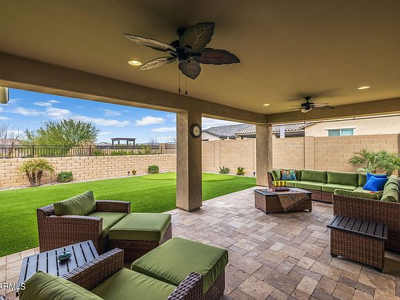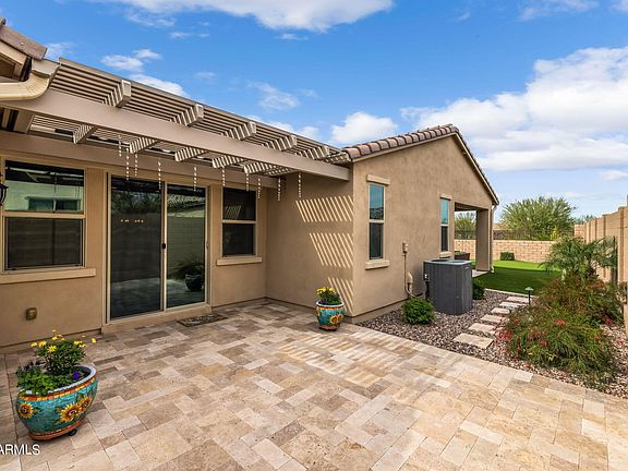This Encore home boasts 3 bedrooms (2 master suites) + den, 2.5 bathrooms, & 3 car garage. A gourmet kitchen features staggered maple cabinets, granite countertops, oversized island, wall oven, speciality drawers, under cabinet lighting, & GE Monogram gas appliances. The double door entry to the office displays built-in cabinets. Ceiling beams adorn the great room + a custom dry bar. The master bath has dual vanities, while both bathrooms feature safety bars & handheld shower heads. A backyard oasis offers a private lot, Mountain View's, covered patio, & a putting green. Step outside your kitchen nook to another private side patio with pergola & travertine tile. Check out the upgrades list in the photos, too many to name. GE Refrigerator, Washer & Dryer Convey.