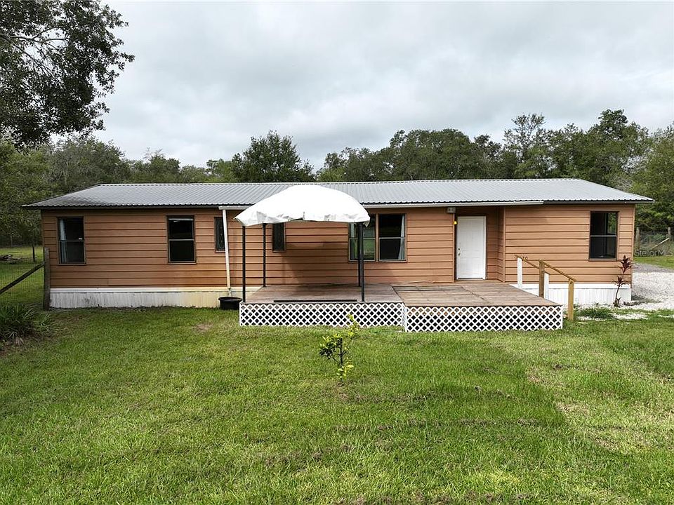 This clean 3 bedroom/ 2 bath home has an open split floor plan, master bath with garden tub/separate shower and a metal roof. It sits on over 2 acres of gorgeous fence in rural cleared surrounded by beautiful oak trees providing privacy and serenity.You feel like you're out in the country, and yet just minutes from shopping, hospital, and I-4. Electricity, septic with pump, and well with water treatment are all in place and recently maintained. The property includes two sheds and remote controlled front gate, Schedule your private Showing today.