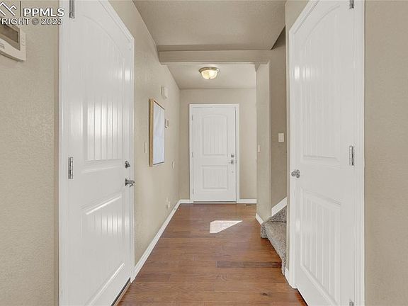 Within walking distance of multiple neighborhood parks & elementary school, this home is in an ideal location. Darling 10x6 covered front porch leads you into an entryway adorned with wood flooring, a coat closet, and a 1/2 bathroom featuring wood flooring & pedestal sink. Also located off the entry is a fully finished 19x18 garage! The wood floors continue throughout the main level & lead you into the great room which has plentiful wall space for furniture or an entertainment center, & windows overlooking the yard! Dining area is open and features a sliding glass door that leads to a 10x20 patio, perfect for summer dining. The gorgeous kitchen is adorned with granite counters, a large 32x18 single bowl under-mount sink, stainless steel appliances, an island, & a spacious pantry! Up the half-turn staircase is just over 1,000 square & features a well laid-out floor plan. A spacious laundry room is located at the top of the staircase & features tile flooring, a window for natural light, & shelving for storage with hanging space for clothing. Also located on the upper level are three secondary bedrooms (one with a walk-in closet & one with mtn views, & the master bedroom with Pikes Peak views, a vaulted ceiling, 5x9 walk-in closet, and an attached 3/4 bathroom with tile flooring, a raised vanity with double sinks, and an over-sized shower with a tile surround and mosaic tile inlay. The unfinished basement has rough-in plumbing for future bathroom, and space for a future family room, or leave it unfinished for a workout room, an art studio, or those cold snowy days to ride tricycles & burn up the energy! Enjoy summer evenings roasting hot dogs and marshmallows around the fire-pit! Many hidden features about this home include a built-in humidifier, vinyl windows, a security system, large lot on .13 acres, storage underneath the basement staircase, cable & phone hook-ups in all the bedrooms, fully insulated basement walls, window well grates, & more! MUST SEE!