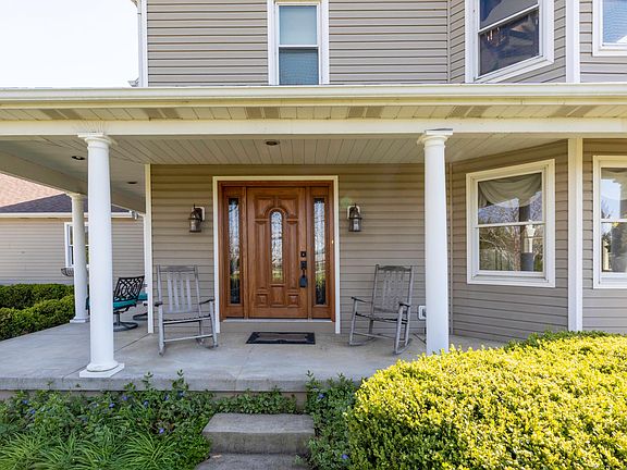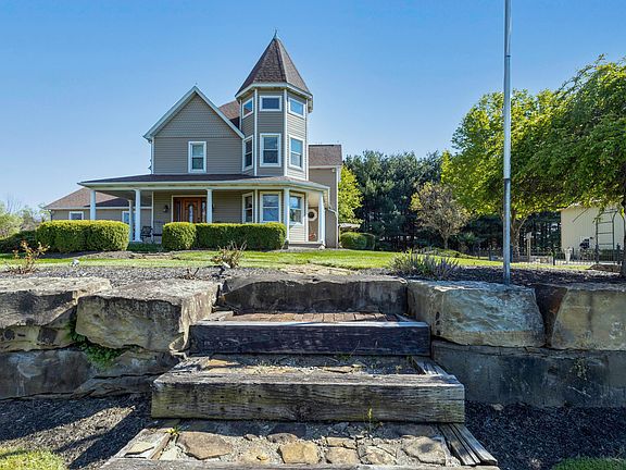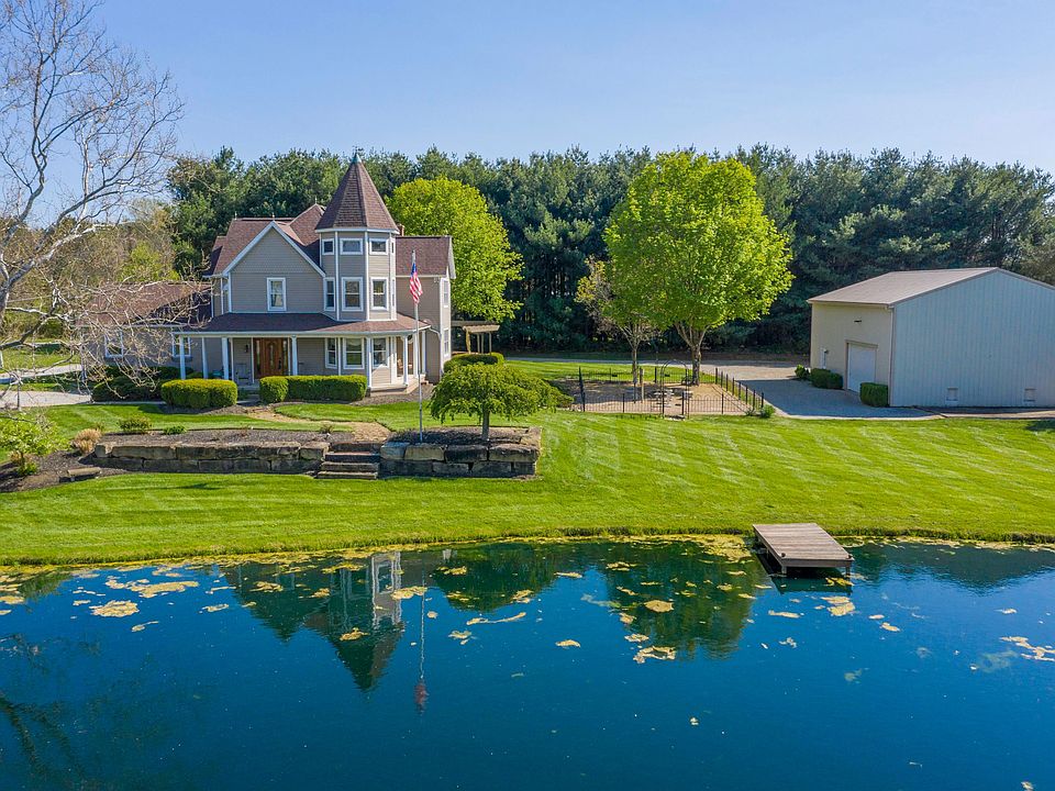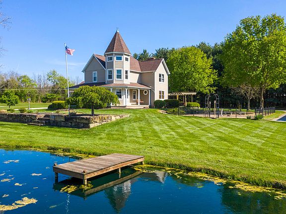 IMPRESSIVE! Meticulous Owners have loved this home! Wrap around deck overlooks a pond on 1.36 acres! Kit features SS appls, loads of cabinets, lg island & granite & is open to a sunroom & fam rm that offers a cozy WBFP. Lg living rm. Lovely crown molding. Beautiful Hand Scraped wood floors thru-out first floor! Owners Suite has updated (2018) pvt bath, 3 closets plus a spiral staircase to a really cool turret offering beautiful views! 2 other good sized bdrms w/WIC's & beautifully updated (2017) full bath! Full bsmt has fin space w/egress window plus lots of storage. 24'x24' Gar is drywalled & has utility sink! Outside you will find a lg paver patio plus courtyard area. 32x48 propane heated pole barn w/wide stairs to loft & water. Heat pump '14. Many updates thru-out! Only 2nd Owners! CA2A