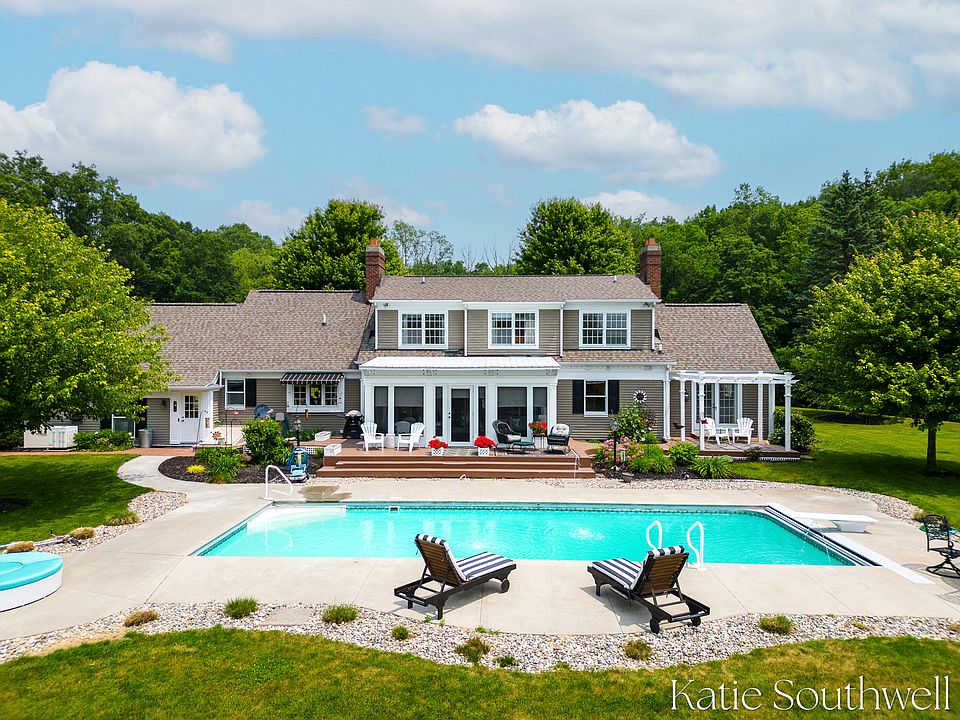 Welcome to a truly unparalleled living experience at this exceptional country estate on 10 1/2 acres. With 4 bedrooms, 4 1/2 baths, and 4,780 square feet of living space, this home has been extensively upgraded and remodeled since 2016. As you enter, you'll be greeted by a beautiful marble entryway and winding staircase. The main floor features a transformed primary bedroom suite with remodeled bath, and custom built walk-in closet; a fully remodeled custom kitchen showcasing quartz countertops, high-end appliances, gorgeous hardwood floors, eating area and adjacent to sitting room. Upstairs you'll find 3 more bedrooms and 2 full baths. Lower level provides a workout room, family room, full bath, additional laundry, & ample storage. With 2.5 stall attached garage, and 5 outbuildings to suit your needs, there's generous car storage and workshop possibilities. From the picturesque 30'x48' insulated barn, with heat and water, to the matching pole barn, there's plenty of room for all your toys and collections. 2 more outbuildings provide additional storage and for those seeking a quiet retreat, the adorable she-shed offers a cozy escape. The refreshing 20'x40' saltwater pool will entertain your family and guests. The large circle drive and oversized parking areas provide ample space for vehicles and has been utilized as a pickleball court. Security and privacy are paramount with the commercial-grade automatic gate at driveway entry. What sets this home apart is its incredible setting, abundant wildlife, and endless entertainment possibilities. The one-mile dedicated walking/running trail that encircles the property allows you to immerse yourself in nature. Additionally, there's a dirt bike and quad trail, rope swings, wooded food plots, and two large viewing or hunting towers. Two fire pits, and a back hill that can be used as a waterslide further enhance the outdoor fun. You'll enjoy the added bonus of a meadow frequented by local wildlife such as deer, turkeys, and sandhill cranes. Secluded with forests to the north, west, and south, you can enjoy wide-open views of the meadow and yard from both the house and the pool. Despite its secluded ambiance, this remarkable estate offers easy access to nearby amenities. Caledonia is just 8 minutes away; 20 minutes to Ada and 30 minutes to downtown GR. Embrace the opportunity to own this extraordinary property that combines luxurious living, natural beauty, and a truly serene lifestyle.
