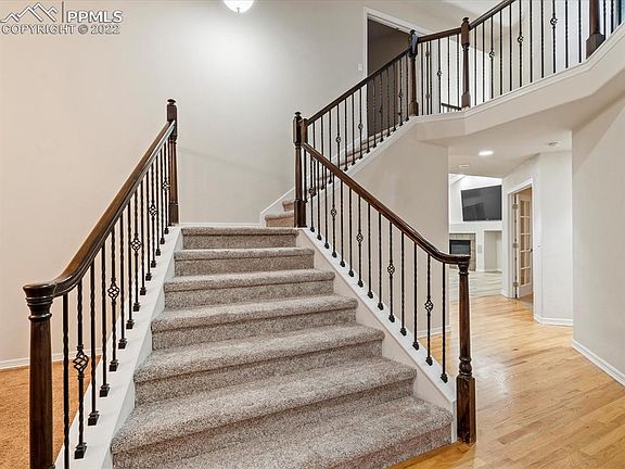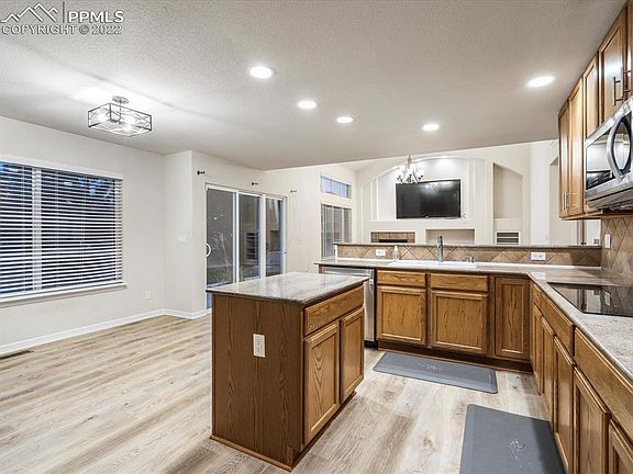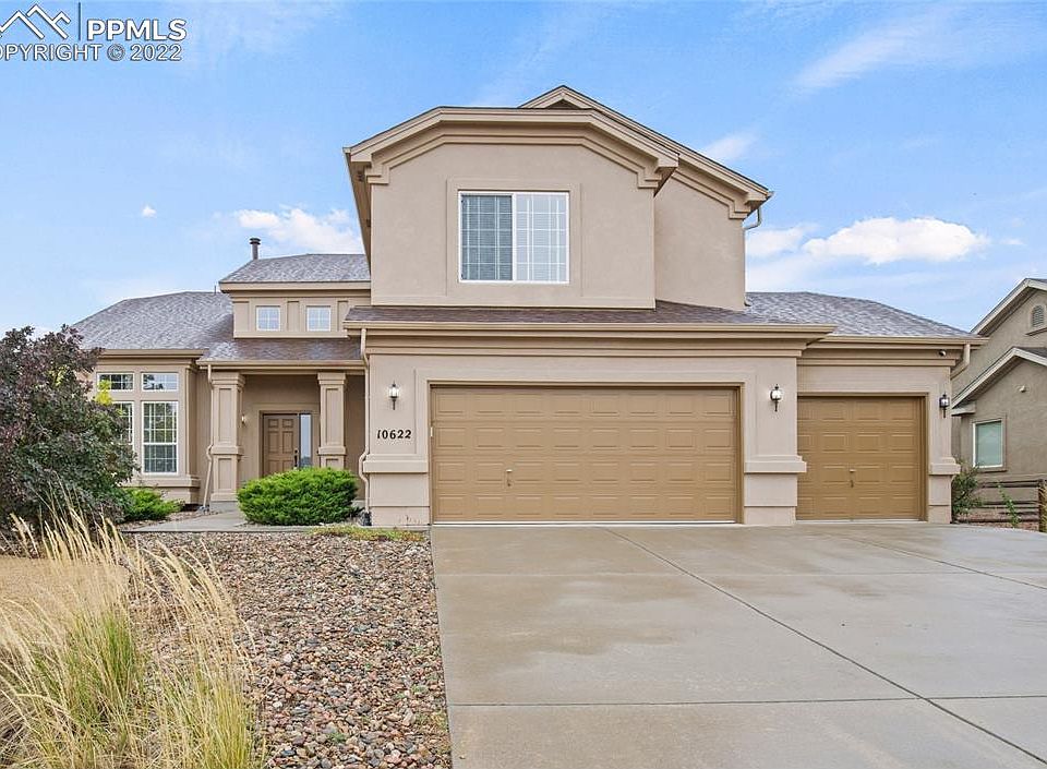 Beautiful home with over 4500sqft of finished living space in the desirable Meridian Ranch community, all for under 600k! Walk into this home and be greeted by wood floors and vaulted ceilings. The main floor features a large kitchen with granite countertops, updated flooring, island, double oven, and bar seating that flows into the family room, perfect for entertaining! The family room comes with a huge, mounted, 80-inch TV, gas fireplace, built-in surround sound, and vaulted ceilings. The main floor also features an office with french doors, dining room, half-bath, two coat closets, and laundry room with sink. Upstairs boasts a huge master bedroom with 5-piece bathroom. Also upstairs are three large bedrooms, each with walk-in closets, and small loft with cabinet storage. The finished basement has tons of open space for entertaining, or room to add in two additional bedrooms and additional bathroom to make this a 6 bedroom, 4 bathroom home. The backyard is newly landscaped, has a large concrete patio, and comes fully fenced with a sprinkler system. The three-car garage comes with metal shelving for added storage. This home has a new roof from 2020, two water heaters, two furnaces, two new A/C units, and is wired with ADT security. As bonuses, this community has an award winning golf course, access to great schools, a huge 42,000 sqft recreational center with indoor and outdoor pools, as well as miles of walking trails and parks. Come experience this beautiful home today!