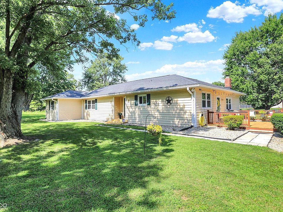 Rare Find!!! Amazing Ranch Home Situated on gorgeous 1 Acre Lot, NO HOA! 4 Beds, Office, 2.5 baths in Fishers... AND a 3-4 Car garage, with that extra Workshop space great for Golf Cart or Motorcycle storage. You do not want to miss this. This home has curb appeal and charm from the minute you pull into the driveway!! You will step up to a Large deck just completely updated that would be wonderful for morning coffee or a relaxing evening after work. Step inside to a spacious Family room with Brick Hearth, Wood Burning fireplace with a cool Barn house wood mantel. Family Room offers easy access to another large patio sitting area that overlooks the peaceful yard & New Storage Barn with Loft. You will enjoy the Large Updated Kitchen and Breakfast area that offers new floors, tile backsplash and stainless steel appliances included. Check out the wonderful Primary Bedroom that offers an updated ensuite Bath with Double Sinks, walk-in shower plus a HUGE, Walk-in closet. This home is close to everything with easy access for Commuting, Restaurants and Shopping. Many More updates within the last 10 years include: Updated Electrical, HVAC, Well Pump, Roof, Windows, Flooring, Sump pump w/battery Back-up, Perimeter drain, Floored Attic with pull down stairs, appliances, Wash & Dryer, Updated Kitchen and baths. Do not miss this one!!!