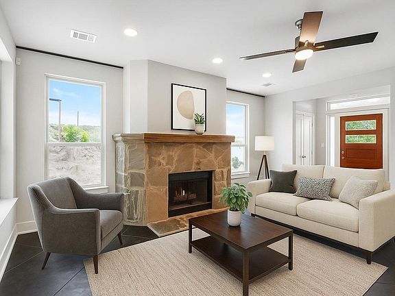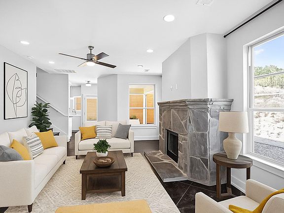 This beautifully designed detached home sits on a scenic view lot and offers a smart, energy-efficient floor plan that feels much larger than its actual square footage. The interior features stained and scored concrete floors on the main level and rich hardwood flooring upstairs. The kitchen and bathrooms are finished with sleek quartz countertops and custom, hand-built cabinets crafted on-site. A wood-burning fireplace with custom rockwork and a stone mantel adds warmth and charm to the main living area. Additional highlights include stainless steel appliances, an alarm system package, Cat 5 and coax central wiring panel, and flat screen TV hookups in all living areas and bedrooms. The home is built with upgraded spray foam insulation, a climate-controlled attic, premium tilt-out windows, and high-efficiency TRANE A/C heat pump systems. Don't miss this opportunity come take a tour today!