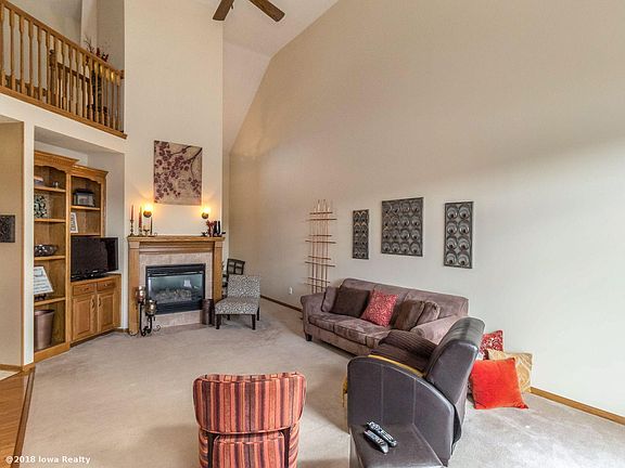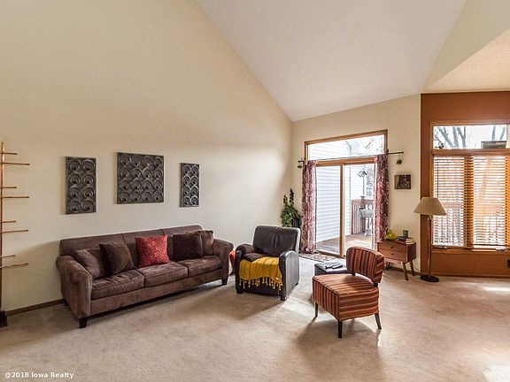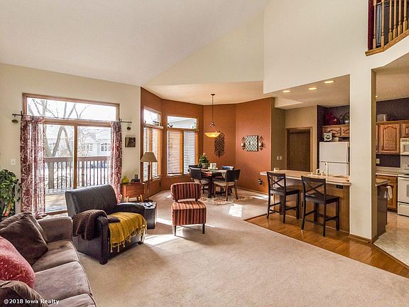 Open floor plan & soaring ceilings in this great Urbandale townhome The home features first floor master bedroom suite with 2 closets & its own full bath with two sinks. Living area, kitchen, laundry & private deck backing to trees. Don't miss the loft, perfect for reading space, office or music room, second bedroom with window seat and 3/4 bath on the second story. The walkout finished level has family room with sliders to a nice patio + a bedroom & storage room and is plumbed for bathroom. Home has transom lighting. Small association on a cul-de-sac. Close to shopping, restaurants & quick access to I-80/35. In great Johnston school district.