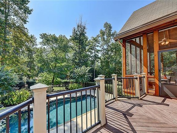 Amazing estate home with gorgeous pool in the heart of Johns Creek in sought after Oxford Mill. The largest home in the community on the largest piece of property, this home has everything you have been looking for. LIVE, WORK, PLAY all at the same address!!!! Luxury... space to spread out and study/work... a gorgeous pool/spa....screened porch and so much more! Over 7200 square feet of total beautiful. Gorgeous custom iron doors welcome you into the dramatic two story foyer. 10 ft ceilings grace the main floor. The heart of the home is the amazing two story, vaulted family room with stacked stone fireplace and built in bookcases open to the chef's kitchen. The well appointed kitchen is everything you imagine it will be with granite counters, stainless appliances and huge walk in pantry but the vaulted eat in breakfast room with natural beam and wood ceiling will wow you beyond belief. Walk outside to your vaulted, screened porch with a "lodge" like feel on one side and to the uncovered deck on the other side. Both outdoor spaces overlook the beautiful pebble tec, heated salt water pool. Expansive grounds beyond the pool make this a private oasis. Lovely staircase with custom wrought iron ballusters leads you to the second floor which boasts four bedrooms and three baths. The master suite is expansive, complete with two closets. The terrace level opens to the pool deck and has a wonderful second family room with fireplace, a full bath and two potential bedrooms. An outside patio and plenty of deck space make entertaining a crowd easy. Lots of unfinished storage as well. And if this is not enough.. the house is equipped with an elaborate sound system that wraps this house up with a bow on top!!!