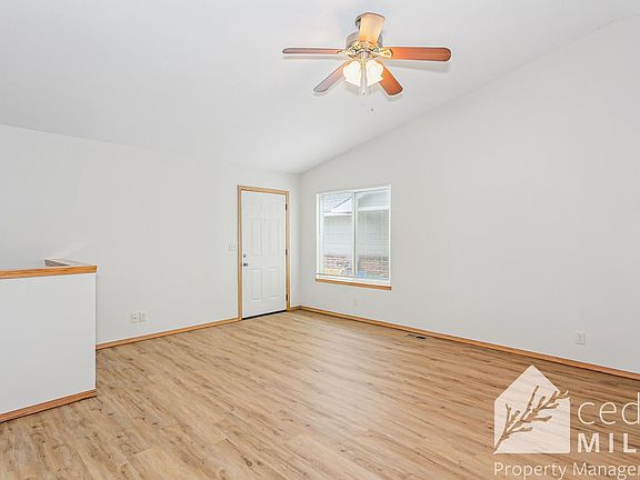 Upstairs the living room is roomy and open and has new carpet and paint. The kitchen is large and overlooks the dining area, both of these rooms have hard vinyl flooring. The kitchen has tons of counter space and updated countertops and backsplash. Appliances include built in microwave, range and refrigerator. Two very large bedrooms and one bathroom are on this level and the laundry room is in the back of the property by the back door.