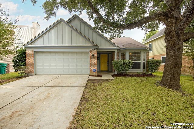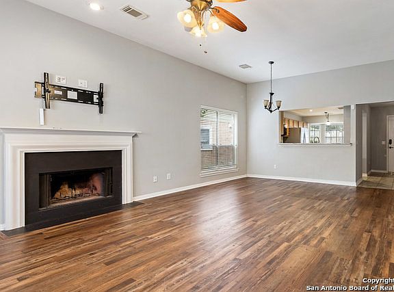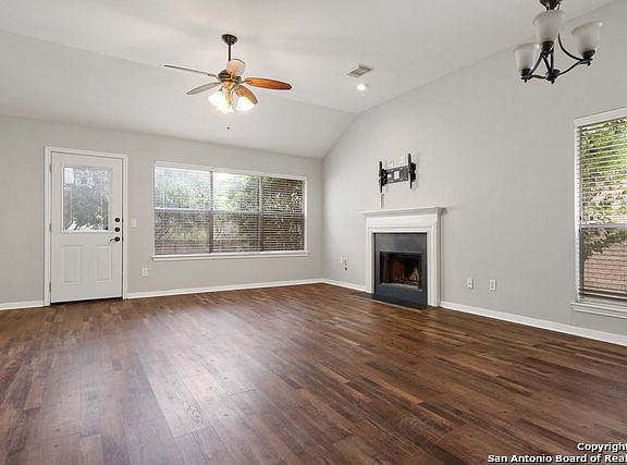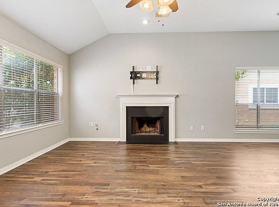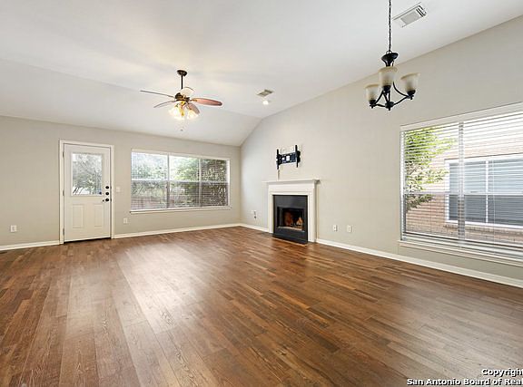 This home has all the bells and whistles! Newer A/C 2017. Sprinkler system front and back. Custom built shed 2016. Newer roof 2019. Newer furnace 2020. Immaculate home with mature trees. Ceramic tile entry and wet areas. Updated eat-in kitchen with custom granite counters and stainless steel appliances includes refrigerator. Bay window in kitchen. Open living/dining area combo with upgraded vinyl wood floors with high ceilings and gas fireplace. Enjoy the view from the living area to the private greenbelt. Master bedroom suite with high ceilings includes full bath and walk-in closet. Master bath with double vanity and separate shower/tub. Privacy fenced backyard with mature trees. Two car attached garage with electric garage door opener. Minutes to Fort Sam Houston and Randolph Air Force Base. Near shops and restaurants. Easy access to IH-35.