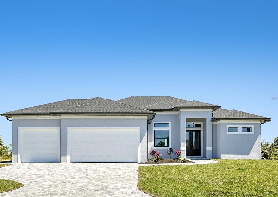 Under Construction. This stunning newly constructed home in the picturesque South Gulf Cove area is nearly complete and move-in ready! Positioned on the tranquil Harlingen Waterway, this luxurious 3-bedroom, 2-bathroom, 3-car garage, pool home provides effortless access to the Gulf of Mexico, located just around the corner from the Santa Cruz waterway. Boating activities and fishing can start right in your backyard with gulf sailboat access. The home features luxurious wood-plank tile throughout, PGT Impact zero radius sliders and windows, dark hardware finishes, 10-foot ceilings, and a 14-foot vaulted entryway. Tray ceilings are featured in the living room and master bedroom, while the master bed and bath offer dual walk-in closets, dual vanities, and even a dual entry shower. The kitchen boasts stainless steel GE appliances, solid quartz countertops, and light-finished soft closing cabinets and drawers. The paver driveway, pool, and lanai area overlook the canal, and the heated pool includes a sun lounge area. Don't miss out on the opportunity to own this boating paradise, just a short ride to the wide open waters of the Gulf of Mexico!
