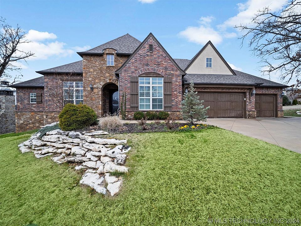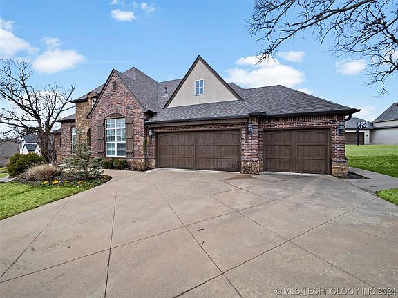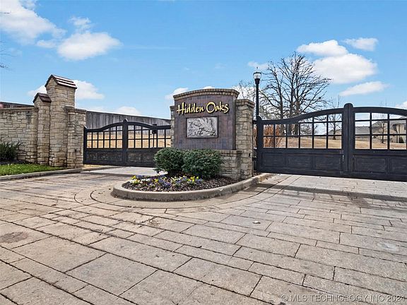 Beautiful home nestled within a gated community on an exclusive hilltop in Jenks! A rare find: one story home with 3 car garage, 3 bedrooms plus a designated office, 2.5 bathrooms and an open floor plan with gorgeous updates! Extensive wood floors throughout except tile in "wet areas". Kitchen cabinets updated with white paint, lovely granite with island and bar seating! Eat in area, stainless appliances and updated lighting. Refrigerator stays plus wine fridge. Updated bathrooms, interior paint, lovely stained beams in kitchen, living room and office. Kitchen also features a large walk in pantry. Main suite has double trayed ceilings, wood flooring, new paint, extensive crown molding, spacious walk in closet and gorgeous updated bathroom. With tons of pantry space and dual sinks, you'll have lots of storage options. Oversized walk in shower and a separate, free-standing soaker tub. Second full bath is completely renovated as well with large tiled walk-in shower. Huge laundry room. All TVs and gun safe stay. Three car garage plus a beautiful yard front and back! Large covered patio with beautiful gable over patio and fully fenced yard on a greenbelt so no neighbors up close! This is a true gem close to highways, shopping, dining and more.