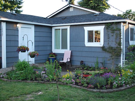 Charming home has been lovingly maintained inside & out. Hardwood floors, updated bath & kitchen appliances incl. Efficient heat pump & AC. Incredible yard features a patio, beautiful perennials that bees love & edible landscaping: mature grape vines, rhubarb, elderberries & more! Garden shed could be chicken coop. Garage was converted to living space for an extra bedroom, office, guest space...unlimited potential or could be switched back to a garage. Easy access to Seattle & SeaTac Airport!